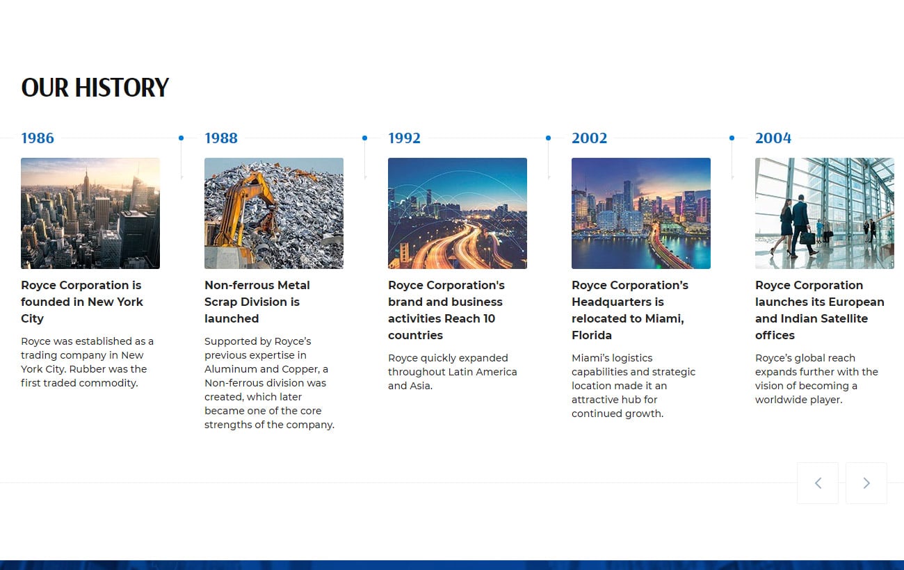 Royce Corporation was founded in New York in 1986 as an international trading firm based in the United States. With its current headquarter located in Miami and offices in Hong Kong, Belgium, Mexico, India, and Brazil, Royce is actively involved in daily business and commercial activities in over 60 countries around the world.